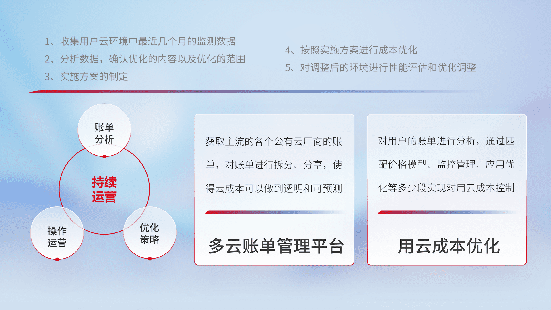 通过灵活运用多种自动化迁移工具,,,,帮助企业用户实现业务和数据高效 、、、稳定的上云迁移和云上迁移,,,,采用自研多云纳管平台,,,以中立管理模式,,,,解决多组织、、多云、、、、多运维厂商的复杂关系的管理,,,保证多云平台资源配置的一致性,,实时掌控云资源运行数据,,,,运用智能化工具分析云资源多云平台的管理服务,,透明化管理成本支出,,用云成本可预测、、用云费用可优化、、、云资源配额有据可依。。。。