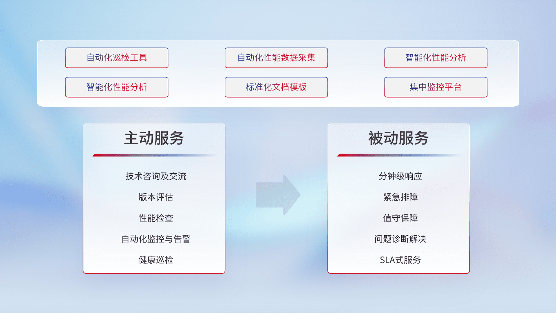 智能化工具和标准化文档,,,,保障服务质量,,提供主动服务(包含技术咨询、、、版本评估、、、性能检查、、、、自动化监控与告警、、、健康巡检)和被动服务包含(分钟级响应、、、紧急排障、、、、值守保障、、、问题诊断解决、、、SLA服务)。。