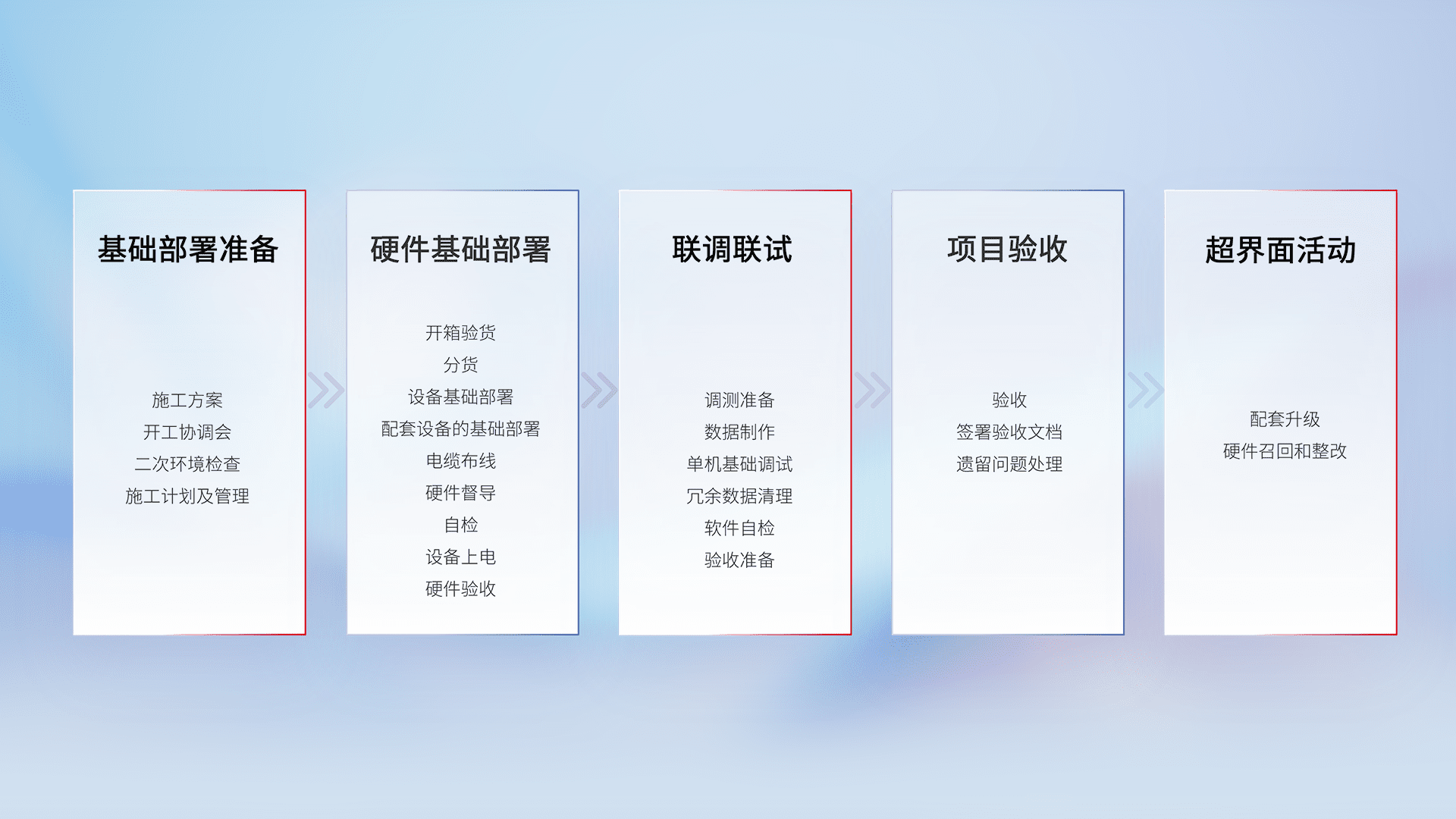 从基础部署准备、、、、硬件基础部署、、、联调联试、、、项目验收、、、越界面活动的全过程可追溯,,,,保证施工质量和进度。。。